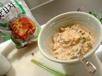 Now that the house smelled great, and the sacred herb doing its thing, it was time for the kimchi portion of the ritual. Hailing from the Zion of kimchi, HeeJin set to work preparing pancakes from whole wheat and rice flour, the available veg and some aged and aromatic’ kimchi that was already busy inaugurating the fridge. The pancakes reminded me of Indian pakoras and I’ve decided that they would make a good winter breakfast or snack. HeeJin said that this is Korean comfort food and I was pleased that the evening’s aroma rituals included this auspicious food and panacea.